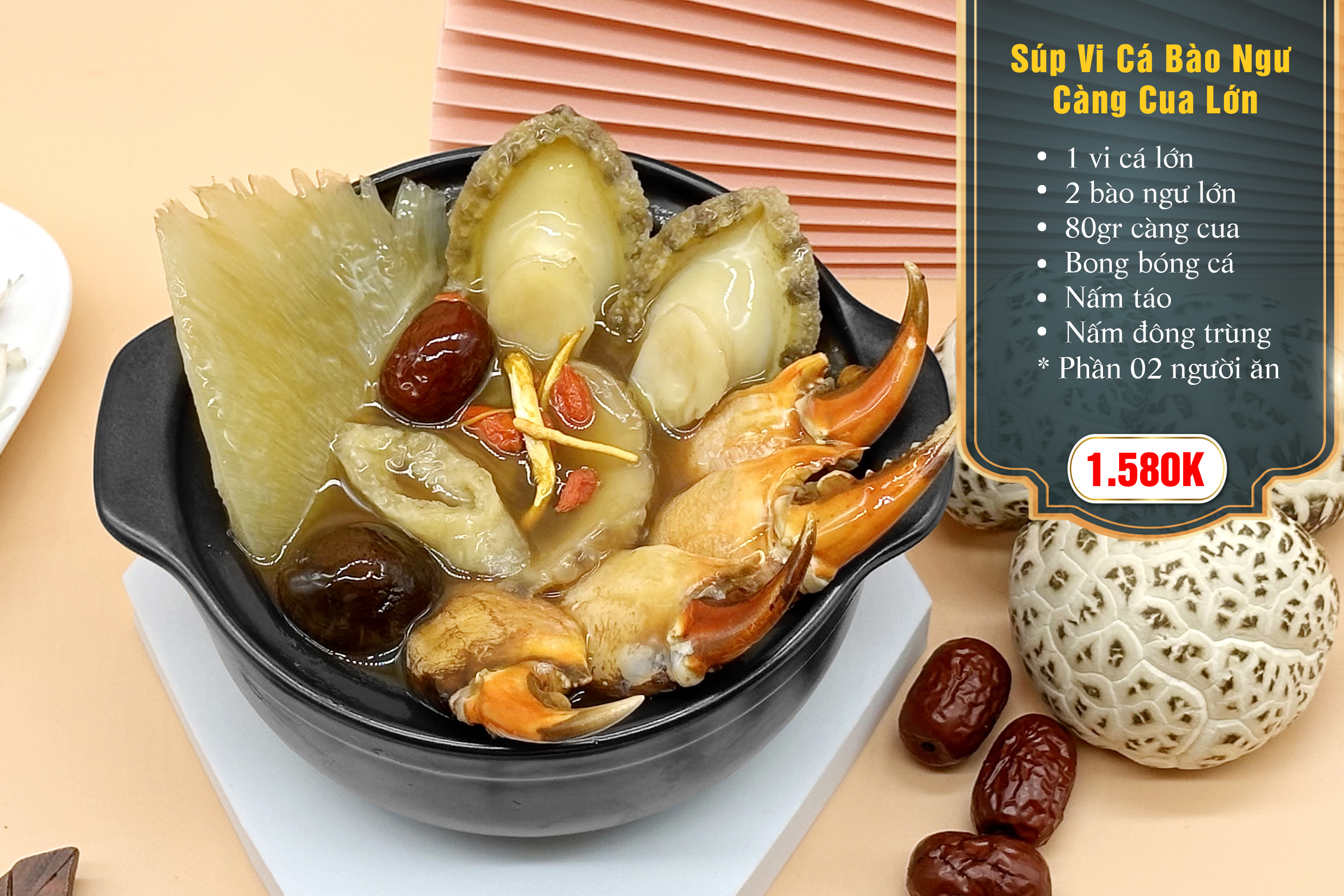Súp Vi Cá Bào Ngư Càng Cua Lớn l à sự kết hợp của các nguyên liệu quý cao cấp như Vi Cá, Bào Ngư, Càng Cua cùng với nước súp dùng 12 loại thảo mộc tạo nên một món ăn tinh túy và bổ dưỡng.